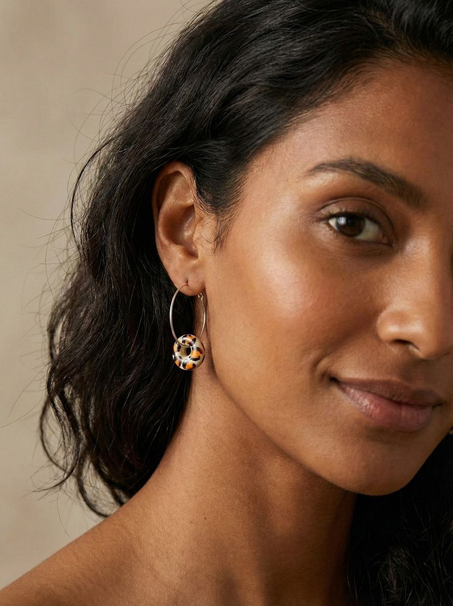 These statement hoops feature slim silver-tone circles threaded with handmade ceramic donut beads in a warm ivory base, hand-painted with bold orange and deep charcoal leopard-like spots. The glossy glaze and curved ring shapes create a lively, almost retro feel, with the pattern wrapping all the way around for movement and interest from every angle. Lightweight but full of personality, they bring a playful, pattern-rich accent to simple tees, dresses, and going-out outfits alike.