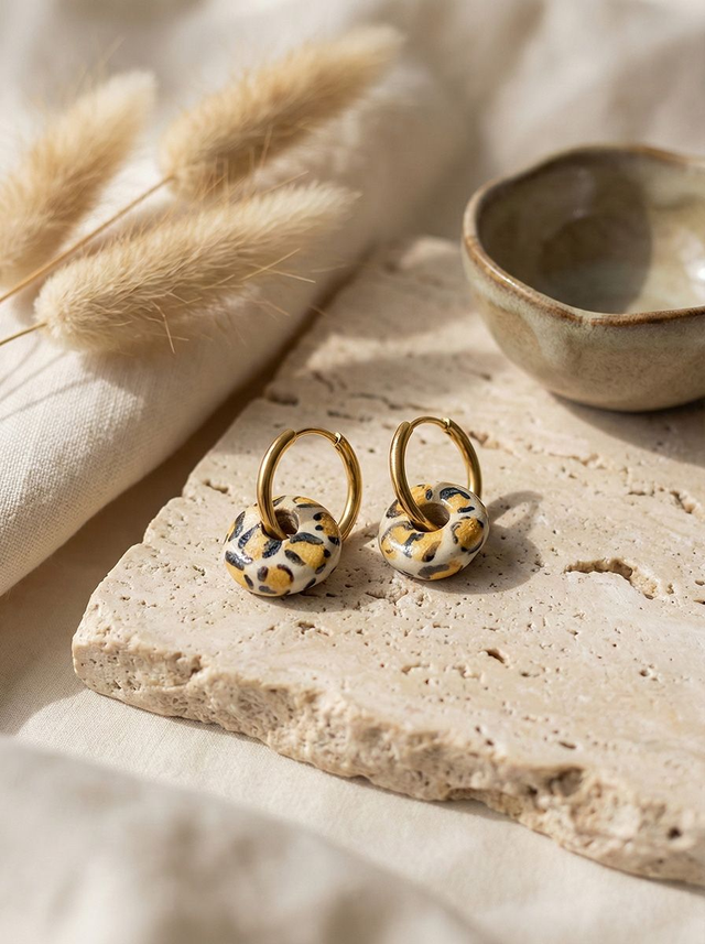 These hand-painted yellow ceramic loop earrings feature a bold animal print design, bringing a touch of wild elegance to your accessory collection. Crafted from durable earthenware clay and fired twice at 1250°C, they combine strength with lightweight comfort for effortless wear.