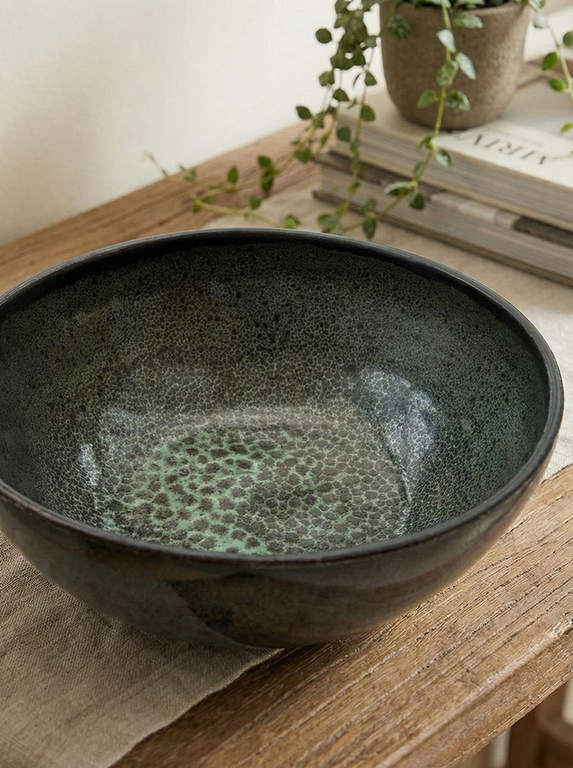 Inside, the bowl is coated in a speckled dark green, creating a very interesting texture.