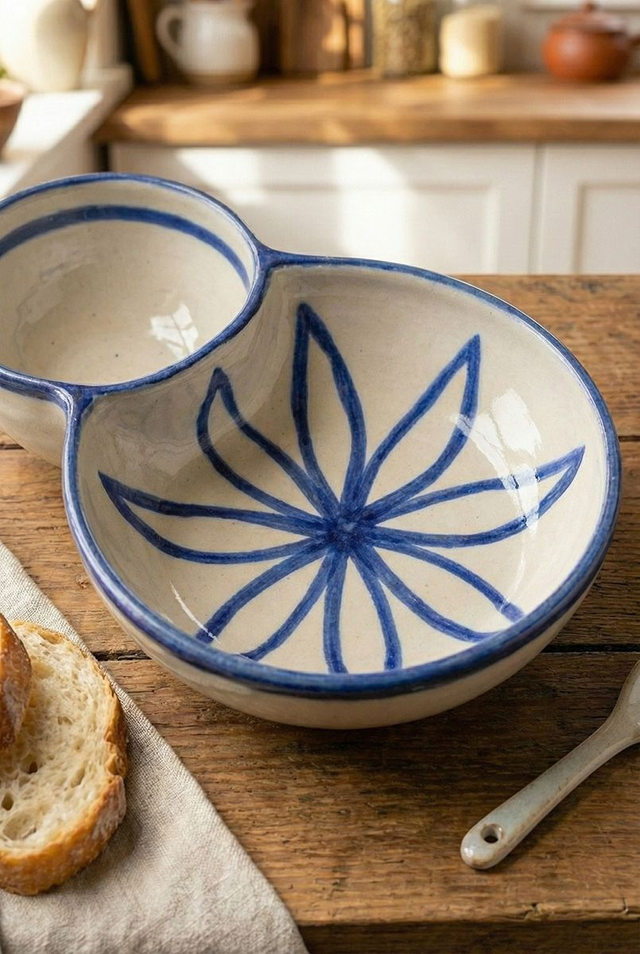 This double-dip bowl blends practicality with a touch of floral charm. One side is perfect for your favourite dips, while the other can hold snacks or olives—making it ideal for effortless entertaining. The interior is hand-painted in cobalt blue with a delicate flower motif, offering a subtle pop of artistry that enriches your table display.