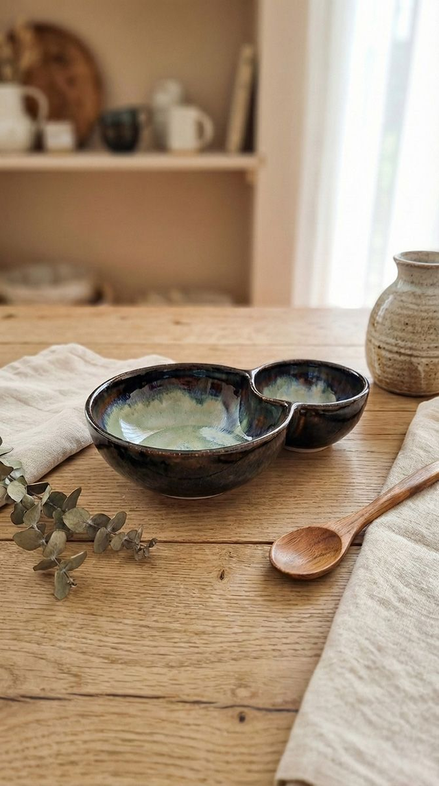 These handcrafted double bowls pair a smaller dip well with a larger snack bowl, making it easy to serve favorites side by side—from hummus and crisps to salsa and cut fruit.