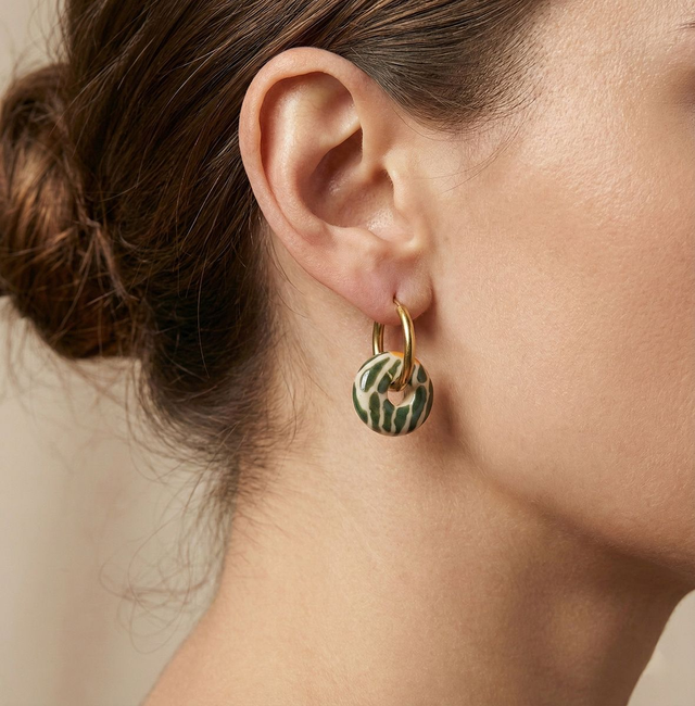 These handmade ceramic earrings are crafted from earthenware clay and fired twice at 1250°C for lasting strength and durability. Each piece is individually hand-painted with a dark green and orange abstract floral motif, making every pair one-of-a-kind.