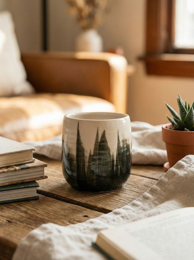 This handleless mug is crafted from white stoneware clay, designed to fit naturally in your hands with its smooth, rounded form. Each piece is hand-painted, with fluid brushstrokes that echo the elegance of Japanese ink paintings. The patterns are spontaneous yet deliberate, making every mug one of a kind.