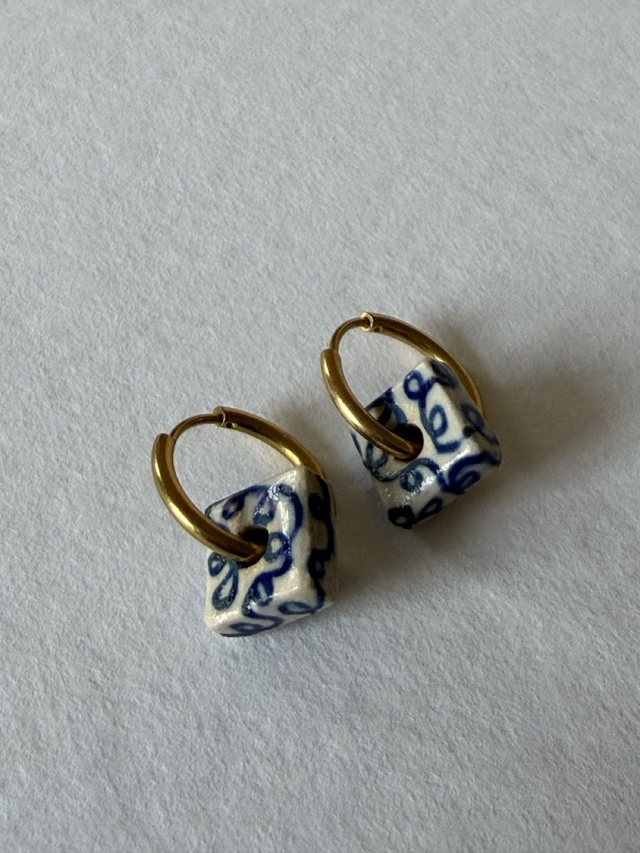 These square hoop earrings pair warm gold-tone stainless-steel hoops with hand-formed ceramic cube beads, glazed in a soft ivory white and adorned with deep indigo scroll-like motifs. The pattern has a subtly hand-drawn feel, echoing traditional ceramic decoration while keeping a modern, playful silhouette that sits close to the ear. Small yet distinctive, they are perfect for everyday wear, adding a touch of studio-crafted character to simple outfits.