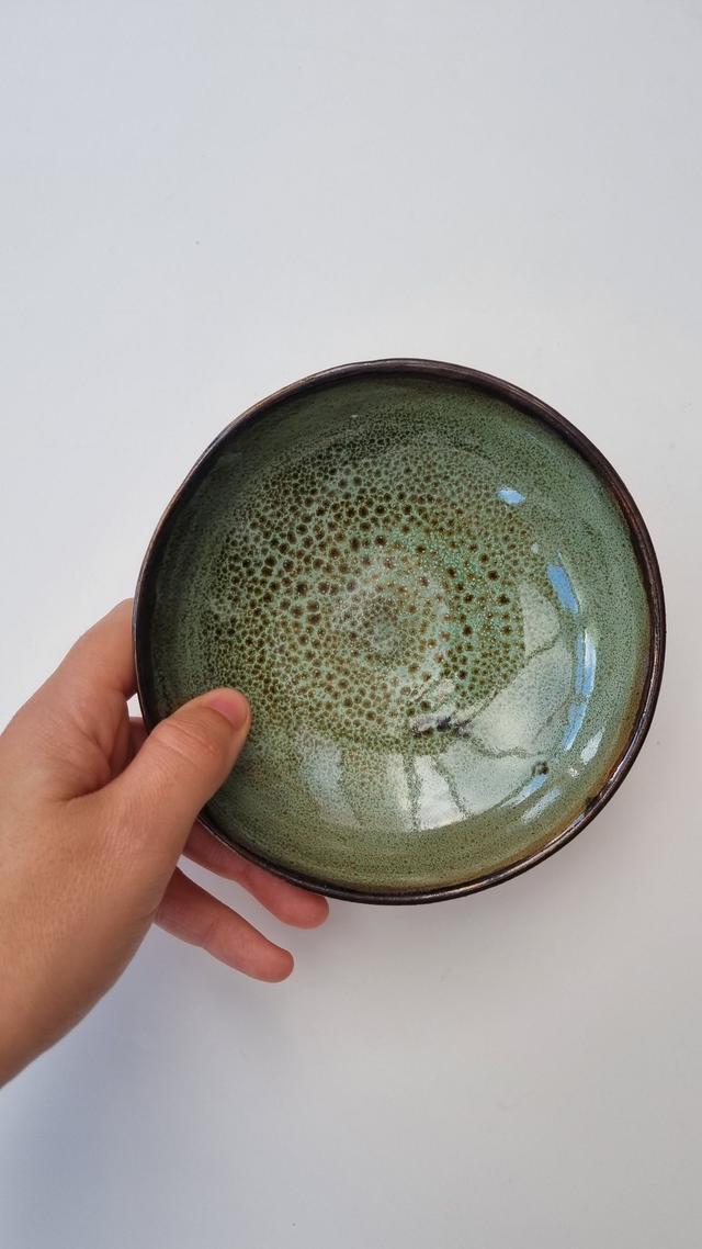 These handcrafted bowls pair the same green-speckled interior with a sleek tenmoku exterior, finished on a clean, flat base for a grounded, contemporary profile. The low, steady stance sits securely on any surface and stacks neatly for everyday use.