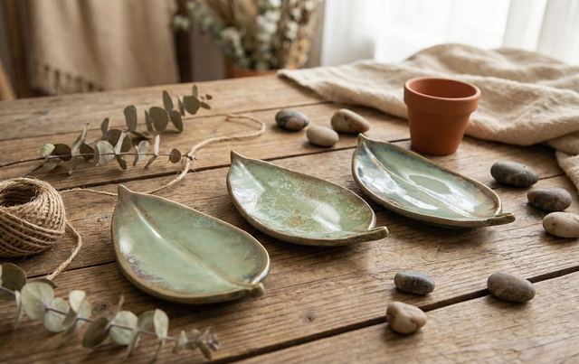 Handmade trinket created by imprinting a real robusta ficus leaf into the clay. Each piece is carefully shaped to follow the organic curves and form of the original leaf, complete with the delicate stem detail that serves as a functional handle.