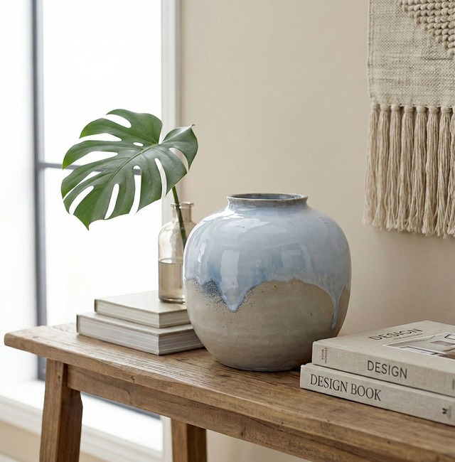 This wheel-thrown stoneware vase has a softly rounded, globe-like form finished in a soothing gradient of glazes that evoke a misty shoreline at dawn. A satin sky-blue pools gently around the shoulder and melts into a sandy, natural clay tone below, suggesting waves receding across wet sand and leaving subtle, organic transitions of colour. With its generous opening and sculptural presence, it works beautifully as a statement vase for seasonal branches or blooms, or simply as a calm, coastal accent on a shelf or sideboard.