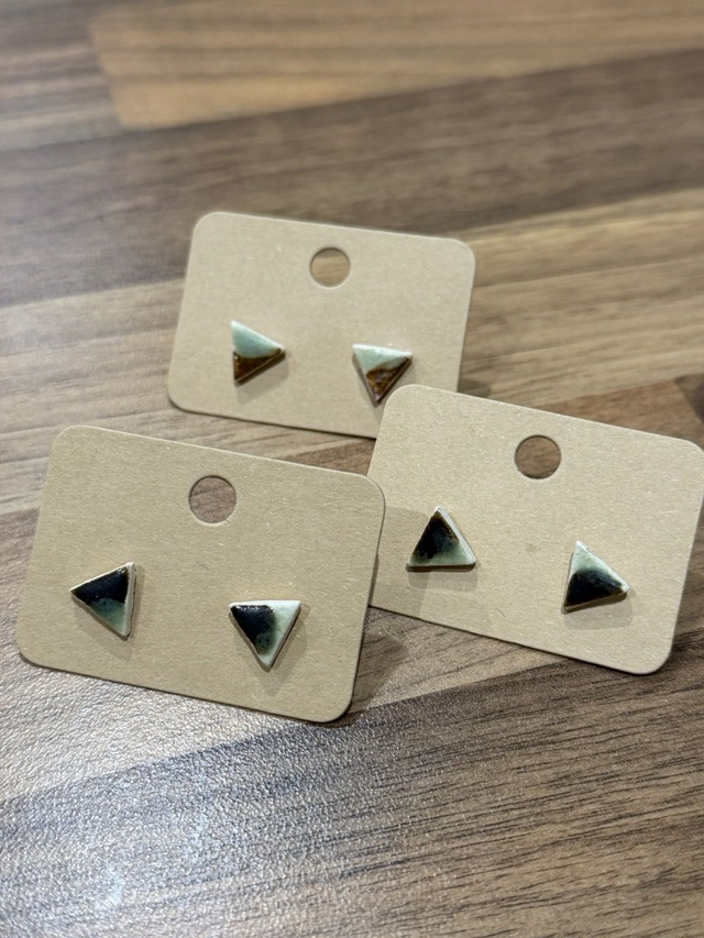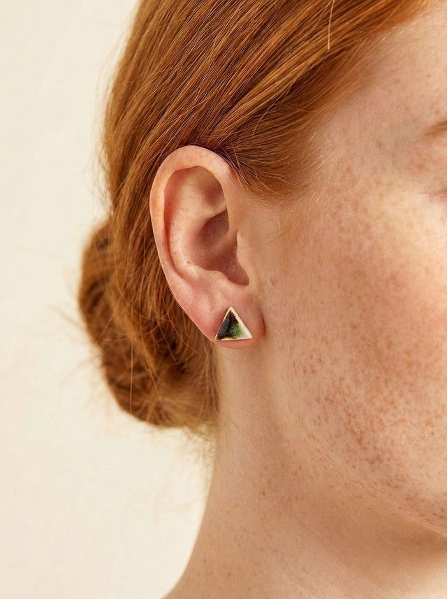 Delicate hand-cut ceramic triangle stud earrings glazed in soft, misty tones that echo distant mountain ridges at dawn. Each tiny triangle blends pale mint, inky charcoal, and warm rust-brown along the base, creating a subtle horizon line that feels both earthy and modern. Lightweight and easy to wear, they add a minimal geometric touch that pairs beautifully with everyday outfits or layered jewellery.
