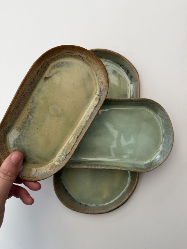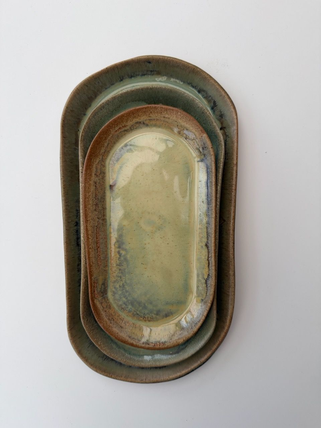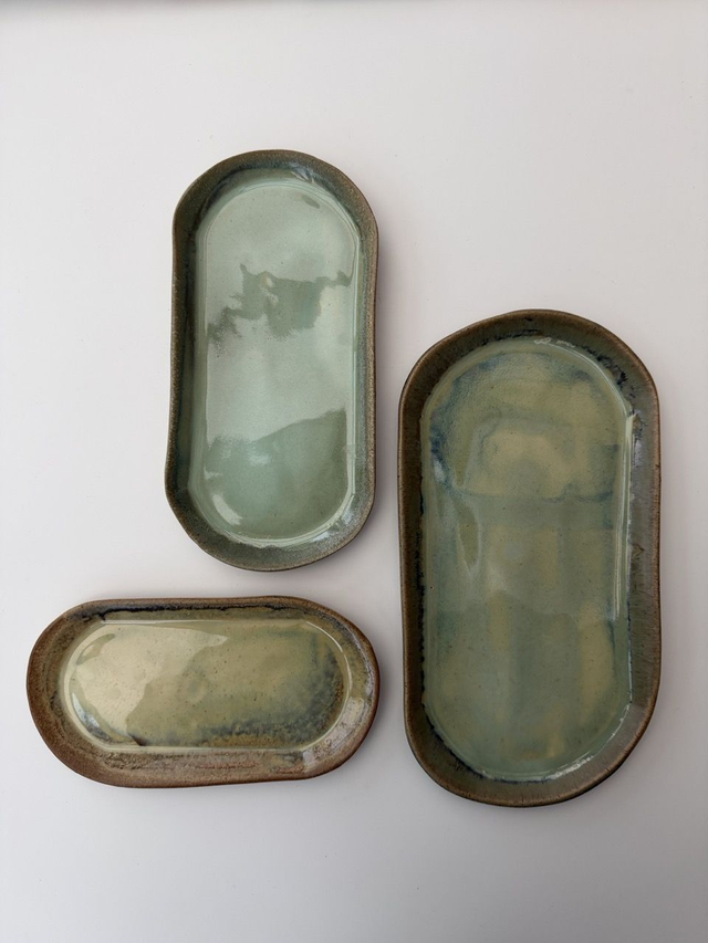 A trio of hand-built stoneware oval trays glazed in soft seafoam and beach-glass tones that evoke gentle waves washing over warm sand. The fluid pools of green and blue drift across a warm, speckled brown rim, creating a subtle coastal gradient where water meets shore. Each tray has a slim, rounded profile perfect for serving small bites, displaying jewellery, soaps, or candles, or styling together as a layered centrepiece on a coffee table or dresser.