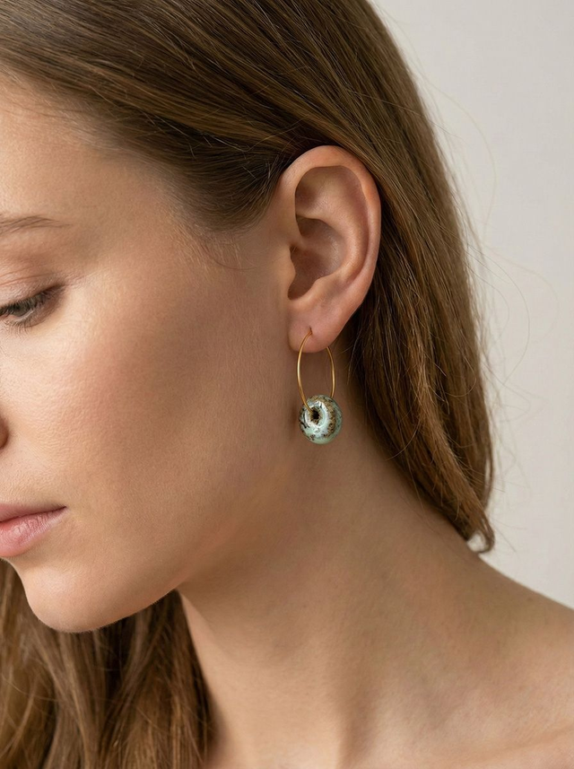 These elegant hoops pair slender gold-tone circles with chunky, hand-formed ceramic donut beads glazed in a soft seafoam green, mottled with earthy brown where the glaze breaks over the form. The watery, variegated surface evokes waves washing over rocks or lichen on coastal stone, giving each bead a unique, tide-worn character. With their gentle movement and ocean-inspired palette, they add a calming, natural touch to both everyday outfits and special occasions.