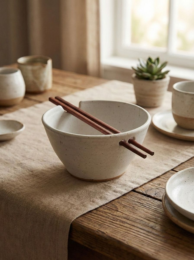 A handmade, wheel-thrown bowl with a carved rest for chopsticks (included, made of sandalwood). The bowl is glazed in a matte finish velvet white colour.