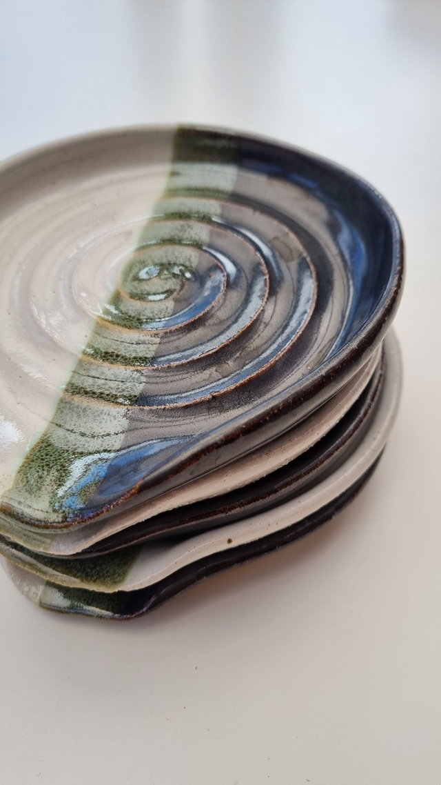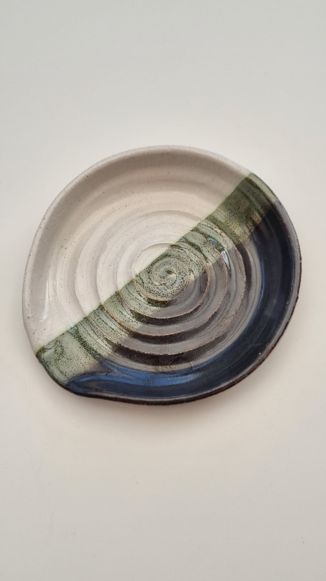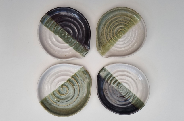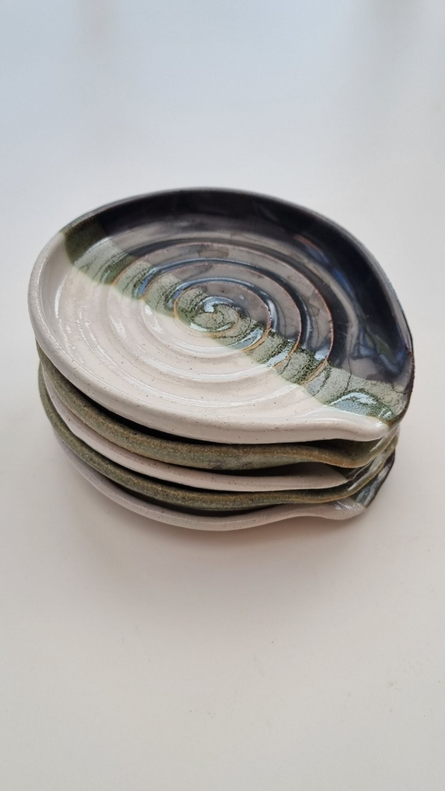 These handcrafted spoon holders keep countertops clean and utensils close at hand, with a shallow well and lifted rim that cradle spoons between stirs. A pressed-clay spiral at center adds grip and visual movement, guiding drips to the middle while celebrating the making marks.