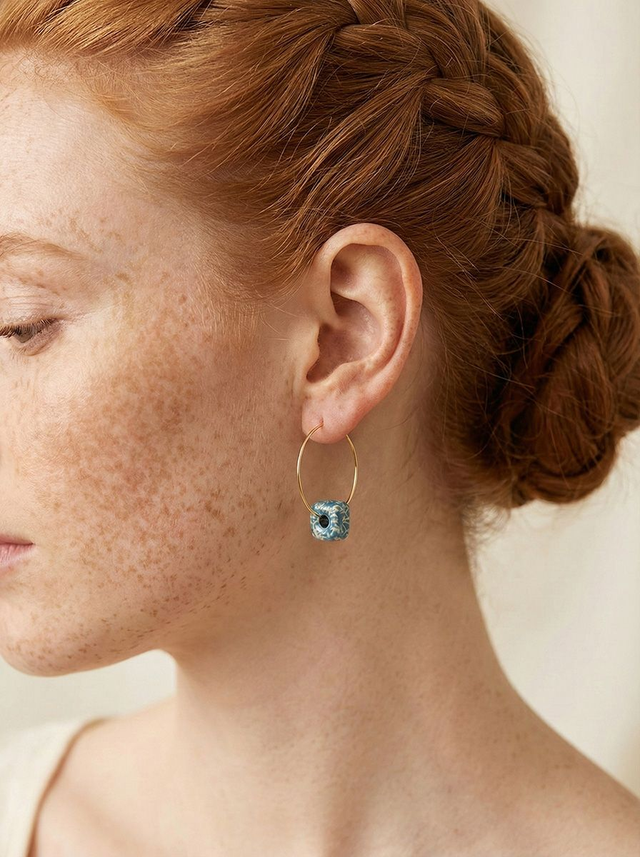 These lightweight hoop earrings pair slender gold-tone stainless-steel circles with handmade ceramic beads in a soft ocean teal, finished with a delicate lace-like pattern that ripples around each edge. The square beads bring a tactile, sculptural feel to the design, while the watery glaze and subtle speckling echo wave foam swirling over coastal rocks. Easy to dress up or down, they add a quiet touch of colour and character to everyday outfits or special occasions.