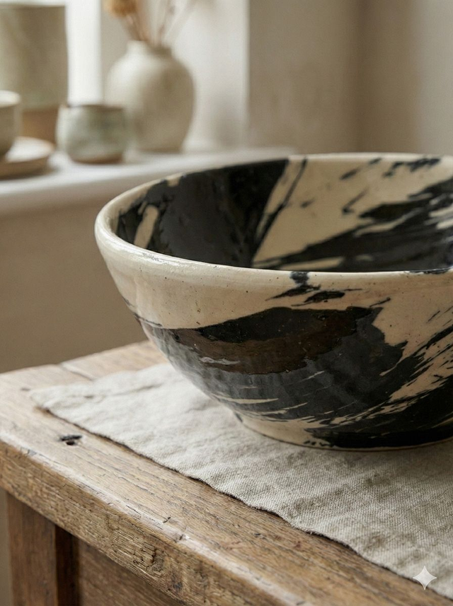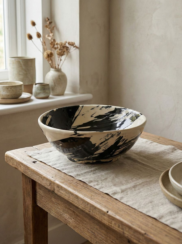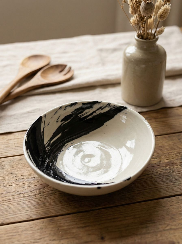 Elevate your tabletop with this striking, hand-painted ceramic bowl. Defined by bold, expressive black brushstrokes against a soft cream glaze, this piece bridges the gap between functional tableware and modern sculpture. Each bowl is uniquely decorated, ensuring that the movement and energy of the artisan's hand are captured in every stroke. Perfect as a standalone statement piece or for serving an elevated meal.
